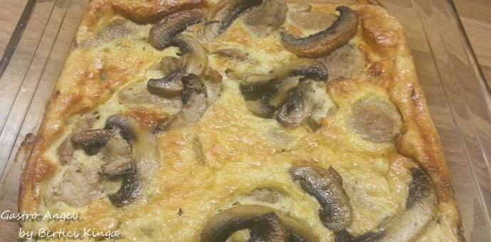 Ciupercile se feliaza si se prajesc intr-o tigaie, daca sunt gata se pun deoparte. Carnea marinata se pune in aceeasi tigaie si se prajesc pe ambele parti. Ouale se bat, se adauga smantana se condimenteaza. Carnea se pune in vas yena si deasupra se pun ouale cu smantana si ciupercile. Se frige in cuptor la 180 grade pana devine rumen.