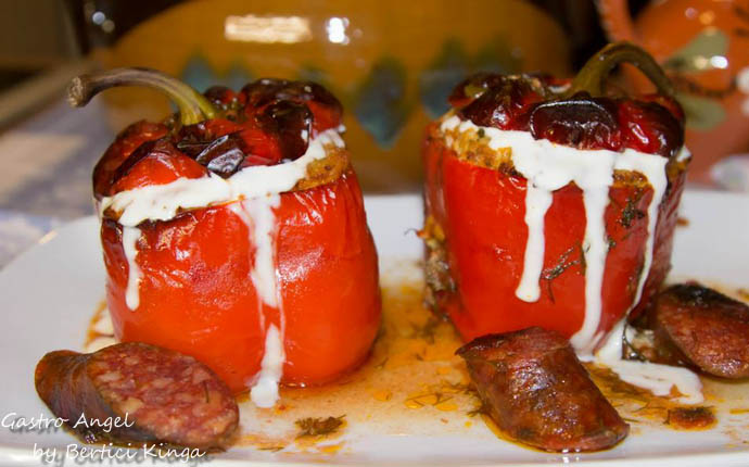 Ardeii spălați se taie roată la capătul cu codița și se scot sâmburii. Ceapa tocată mărunt se călește în puțin ulei, se condimentează și se amestecă cu carnea și orezul. Se umple ardeii cu compoziția de carne, apoi se așează într-o oală de ceramică. Se toarnă peste ei bulionul, se condimentează, se așează peste ei cârnațul tăiat cubulete, apoi se presară cu mărar. Se adaugă apă cât să acopere ardeii. După primil clocot, se acoperă vasul și se fierbe în cuptor încins la 160 de grade aproximativ o oră.