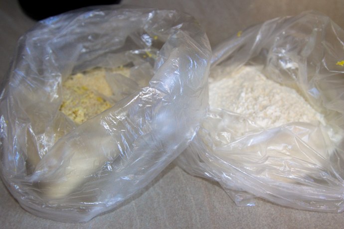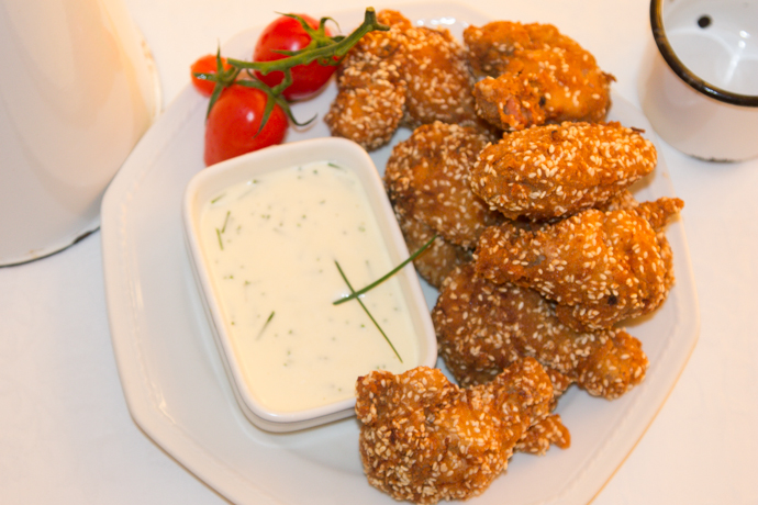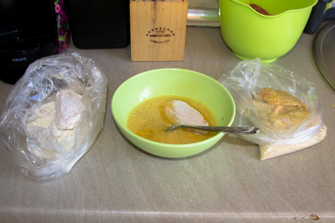 Aripioarele se taie în trei, se condimentează cu sare și piper. Se pune făina într-o pungă, iar pesmetul, semințele de susan și coaja de lămâie în altă pungă. Se bat ouăle cu sare și piper. Aripioarele se așează prima dată în punga cu făină, se scutură bine, apoi se trec prin ouă, după care prin pesmet. Se prăjesc în ulei mult, la foc redus.