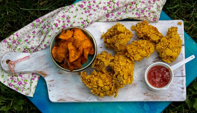 1/2 kg aripioare de pui, 100 g cornflakes (natur), 2 ouă, sare, piper, ulei pentru prăjit, 2 linguri făină, chili cayenne, boia, 1/2 cartofi dulci, sos dulce chili