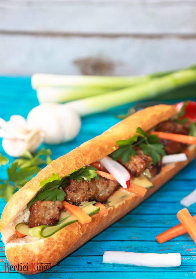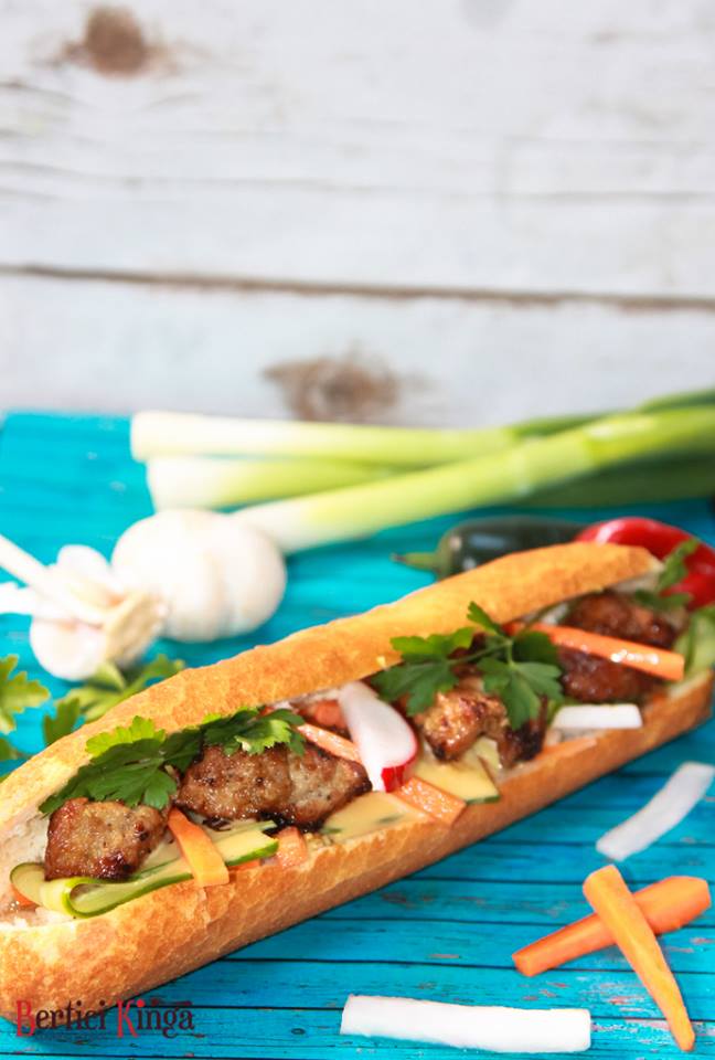 Se pregătește saramura din lemongrass, o lingură de zahăr, o lingură sos de pește și piper. Se lasă carnea timp de 10 minute în saramură. Morcovii și ridichii se taie fâșii și se așează întro lingură de oțet amestecat cu o lingură de zahăr. Carnea se prăjește în tigaie gril timp de 7 minute, apoi se pune deoparte timp de 23 minute. Baghetele se taie în două. Partea de jos se unge cu sos barbecue peste care se așează legumele, castraveții și carnea. Se ornează cu coriandru.