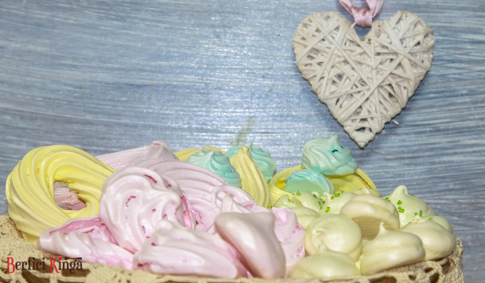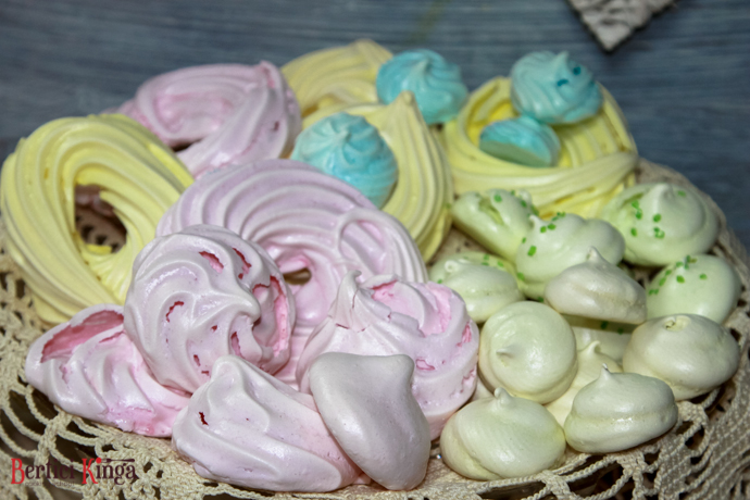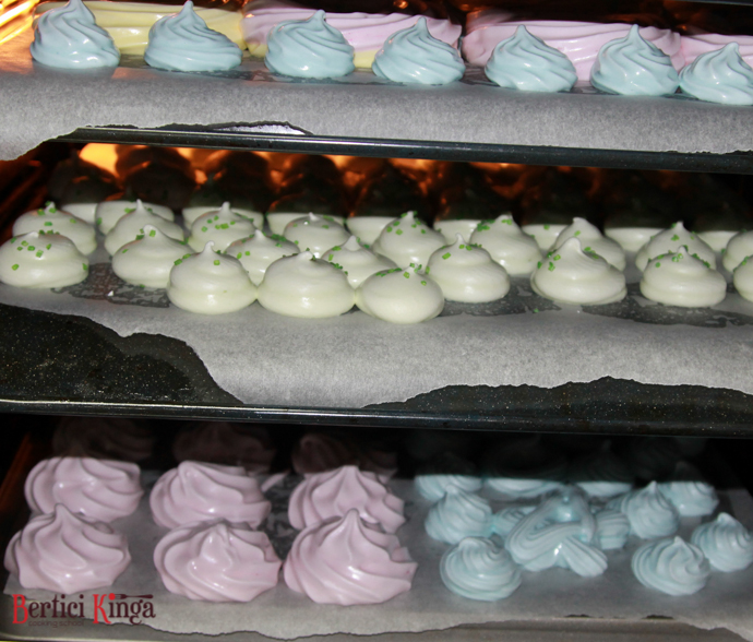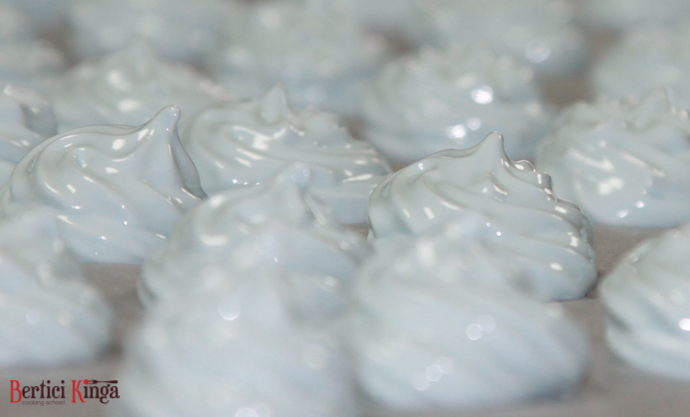 Se bat albușurile cu zahărul și zeama de lămâie până obținem o spumă tare și lucioasă și zahărul se topește de tot. Se adaugă colorantul alimentar, după se modelează în tavă cu un sac de ornat. Se lasă timp de 40 de minute în cuptor încins la 135 de grade, după care se lasă în cuptor să se întărească.