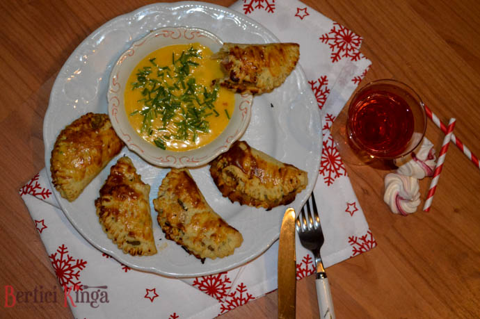 Se amestecă untul cu făina, se condimentează cu sare, piper și oregano. Se frământă cu 2 linguri de apă, după care se lasă timp de 25 de minute la frigider. Se întinde, se taie cercuri, se umple cu carne și se împachetează. Se ung cu ouă și se presară cu semințe de susan.
