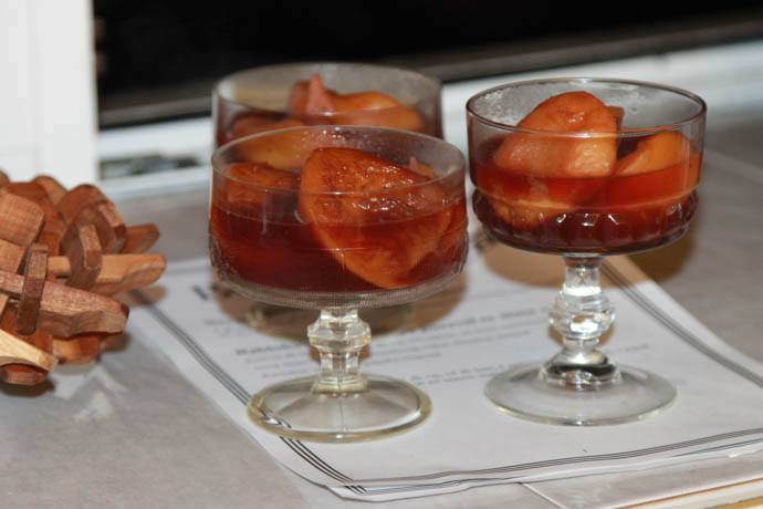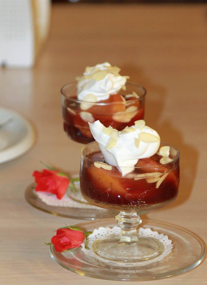Se fierbe apa, se adaugă condimentele și zahărul. Când fierbe se adaugă caisele fără sâmburi. Se lasă pe foc până caisele se înmoaie. Se lasă la răcit. Se bate frișca, se așează deasupra caiselor. Se presară cu migdale.