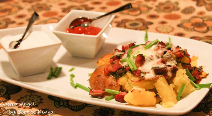 Cartofii se fierb in coaja in apa sarata, apoi se pun pe o tava si se piseaza. Sunca se prajesta in putin ulei, care apoi se presara deasupra cartofilor cu cepsoara maruntita. Untul se imparte in 4, se pune pe cartofi si se presara cascavalul. Se coace la 180 grade 25 de minute.