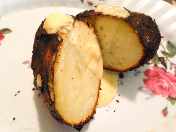 Cartofii se pun pe jăratec. Se pot îmbunătăți dacă pe grill se mai prăjește una-alta a cărei grăsime să cadă pe cartofi.