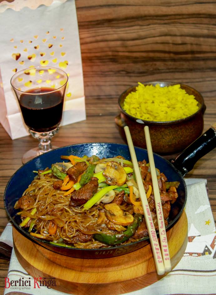 Carnea se lasă în saramură cu ingredientele timp de 10 minute. Se fierb pastele. Se încinge uleiul. Se prăjesc legumele timp de 10 minute. Se scot din tigaia wok, se mai adaugă o lingură de ulei. Se toarnă carnea, împreună cu saramură, în tigaie și se lasă pe foc timp de 10 minute după care se adaugă legumele și pastele.