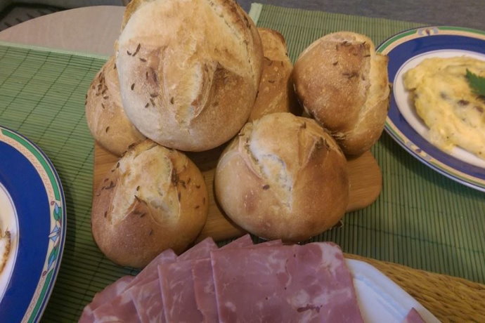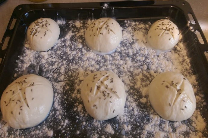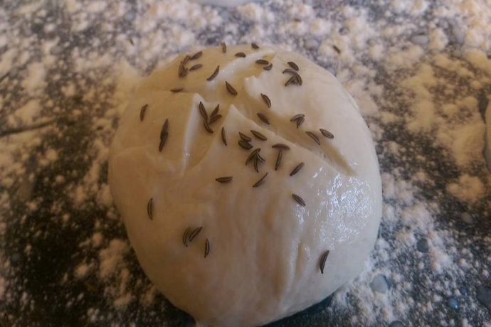 Făina se cerne într-un bol mai mare. În mijlocul făinii se face un gol în care se toarnă puțină apă și drojdia. Se presară cu puțin zahăr și se pune deoparte. Ingredientele se frământă timp de 10 minute cu aparatul. Se mai adaugă apă, dacă compoziția cere. Se modelează, se stropește cu lapte și se presară cu chimen. Se dă la cuptor încins la 180 de grade timp de 30 de minute.
