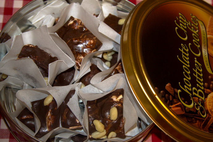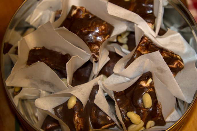 Se topește ciocolata, untul și laptele condensat, se adaugă cacaoa, cafeaua, praful de copt și marshmallow. Îmi place dacă marshmallow rămâne cu cocoloașe, fapt pentru care nu omogenizez de tot. Se toarnă într-o tavă tapetată. Se presară cu alune.