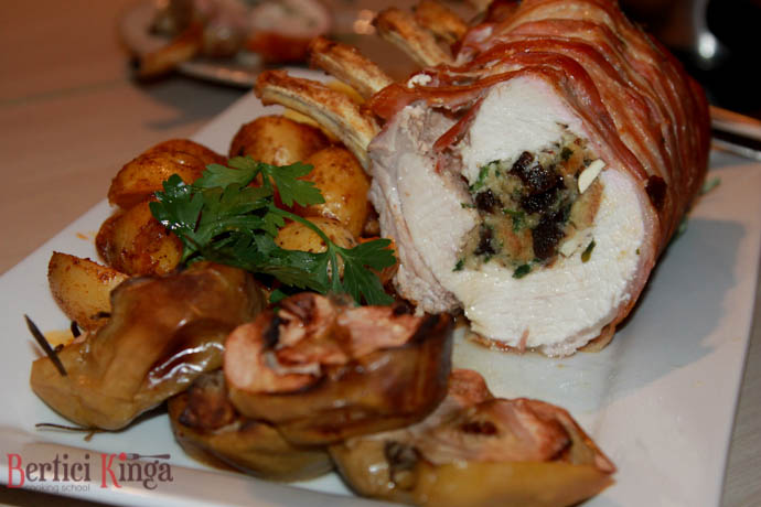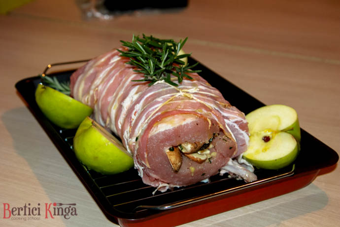 Se pregătește cotletul. Se prepară umplutura. Ciupercile și prunele se toacă mărunt, se adugă pesmetul, usturoiul, pătrunjelul, ouăle și condimentele. Se amestecă bine și se așează în mijlocul cotletului. Se rulează și se învelește în bacon. Se leagă cu ață pentru friptură. Se stropește cu ulei de măsline. Se așează deasupra rozmarinul și merele tăiate în două. Se prăjește în tavă gril la fundul căreia se toarnă 100 ml apă. Se lasă la cuptor încins la 200 de grade timp de 45 de minute.