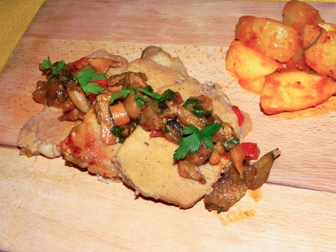 Carnea se condimentează, apoi se prăjește în puțin ulei câte 3 minute fiecare. Ceapa tăiată mărunt se pune în tigaie și se călește. Se adaugă ciupercile și boiaua, după care se subțiază cu vinul. Se condimentează. Se servește cu pătrunjel tocat mărunt presărat deasupra.