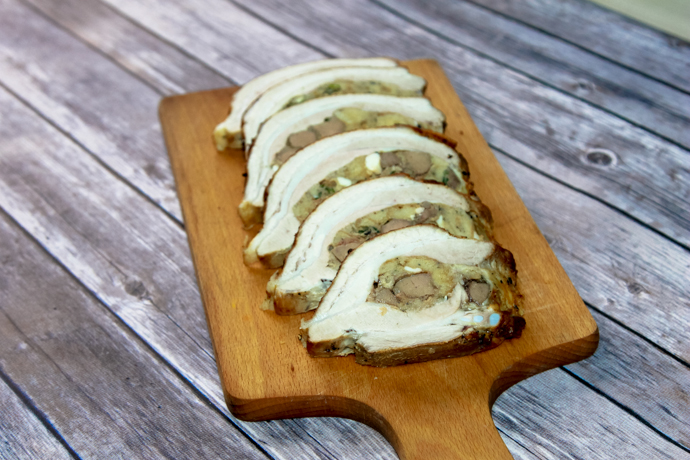 Se condimentează fleica. Se amestecă umplutura, după care se umple în carne. Se coase astfel ca umplutura să nu se scurgă. Se dă la cuptor încins la 170 de grade până rumenește, stropind din când în când cu untură.