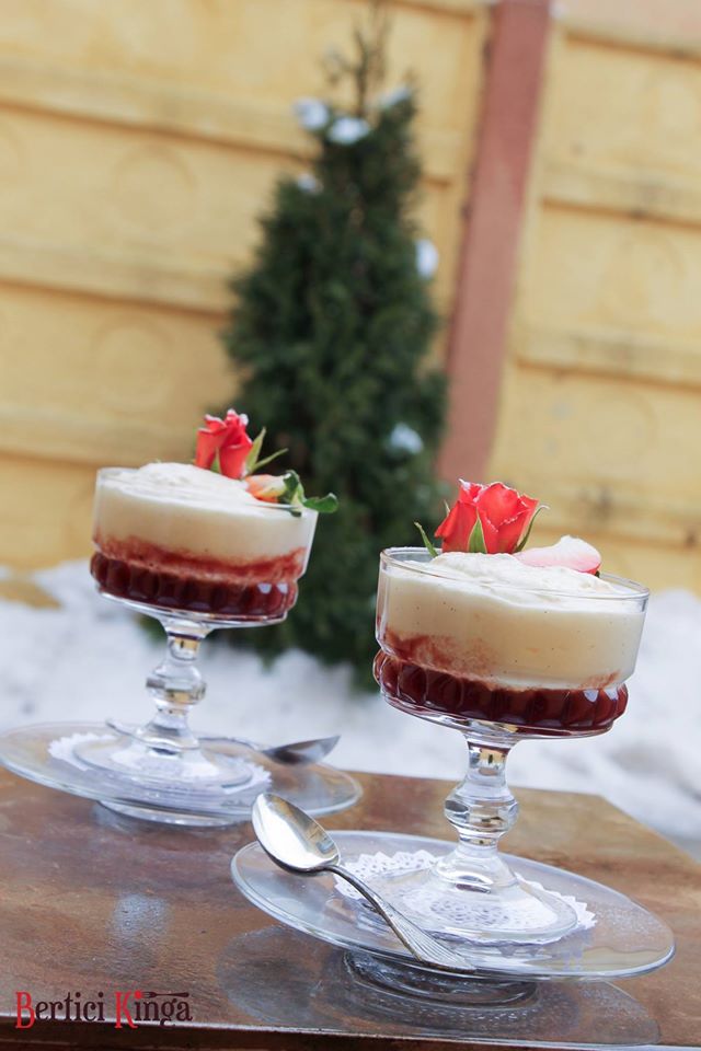 Se așează în pahare: un strat de pireu, un strat de brânză. Se ornează cu trandafiri presărați cu zahăr pudră și căpșuni.
