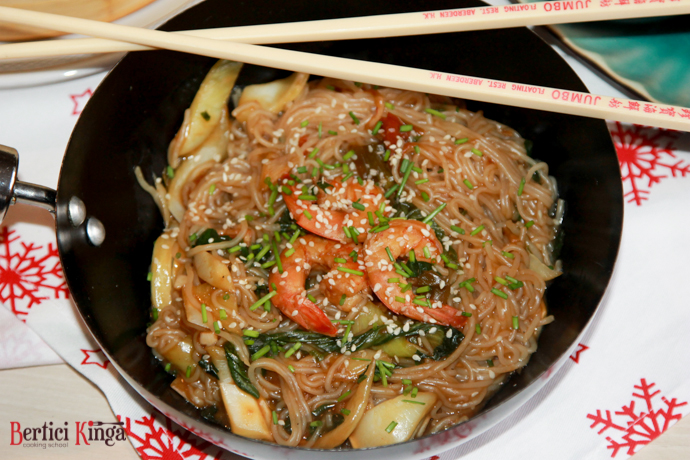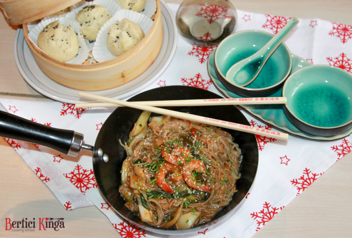 Se încinge uleiul. Se călește ceapa și usturoiul, după care se subțiază cu vin alb. Se adaugă creveții curățați, se acoperă și se lasă să fiarbă timp de 1 minut. Se adaugă sosul de soia și de pește. Pastele se fierb, se amestecă cu creveții. Într-o altă tigaie se prăjește pak choi. Se taie bucăți și se adaugă la paste.