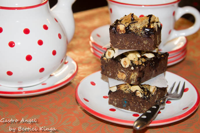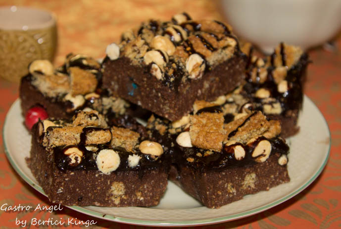 Ciocolata amăruie se topește în baie de aburi. Se pun deoparte 100 g din ea. La cantitatea rămasă se adaugă siropul de zahăr, untul și frișca. Se sfarmă fulgii de ovăz din care se pune deoparte aproximativ un pumn, restul se adaugă la ciocolata topită împreună cu făina de biscuiți și M&M. Se amestecă și se toarnă într-o tavă tapetată cu folie de plastic. Ciocolata pusă deoparte se toarnă deasupra și se presară cu alune și fulgi de ovăz. Se lasă la frigider timp de o oră.