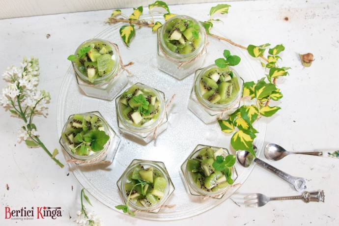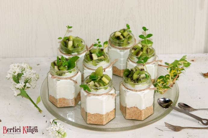 Se topește untul și se amestecă cu biscuiții tocați. Se așează în pahare de sticlă. Se amestecă frișca cu mascarpone și iaurtul după care se introduce într-un sac de ornat și se așează în pahare. Kiwi se taie cubulețe, se amestecă cu mierea și zeama de lămâie, după care se așează și această compoziție în pahare. Se lasă la frigider timp de 3-4 ore.