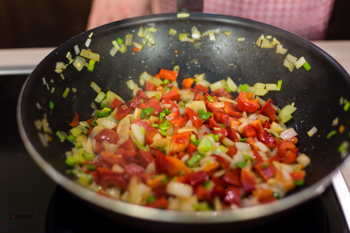 In apa cu sare fierbem farafellele, strecuram si punem sosul si rosiile deasupra.