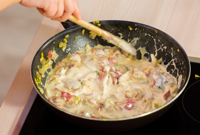 Stropim rosiile cu un pic de ulei de masline si le punem in cuptor la 180 de grade timp de 30 minute la prajit. Calim ceapa cu un strop de ulei, apoi adaugam pieptul de pui. Dupa ce carnea isi schimba culoarea adaugam ciupercile. Turnam vinul si smantana, condimentam dupa gust.