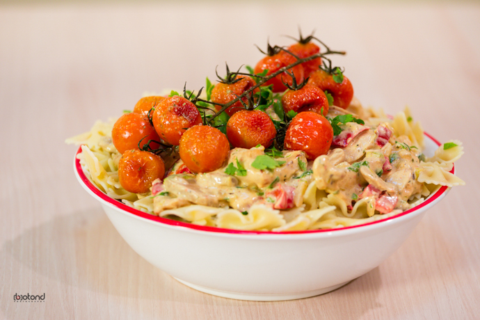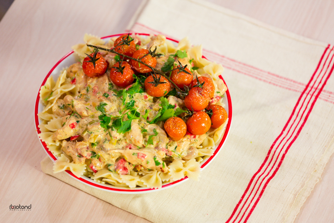 200 gr piept de pui, 1 ceapa, 3 linguri de praz maruntit, 1 ardei california, 100 gr ciuperci, nucsoara, cimbru, 100 ml vin alb, 200 ml smantana lichida, 10 cherry rosii, ulei de masline, 250 gr farafelle, 1 legatura de patrunjel