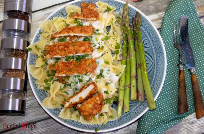 1 piept de pui, 100 g cornflakes (natur), sare, piper, ulei pentru prăjit, 100 g farfalle, 1 lingură făină, 200 ml lapte, nucșoară, chili cayenne, 50 g unt, frunze de pătrunjel