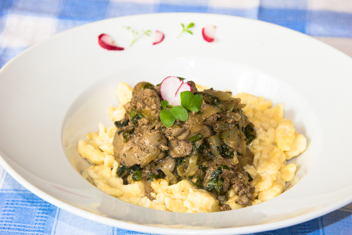 Ceapa tăiată fâșii se prăjește în puțin ulei, după care se adaugă ficatul. După ce se albește, se condimentează și se subțiază cu 50 ml apă. Se lasă la foc până apa scade.