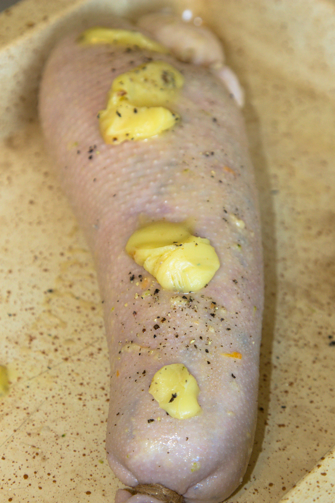 gasca, si o introducem in cuptorul preancalzit la o temperatura de 180 grade, se prajeste pana primeste o culoare aurie. La un interval de aproximativ 15 minute, se unge cu untura de gasca ca sa nu crape.
