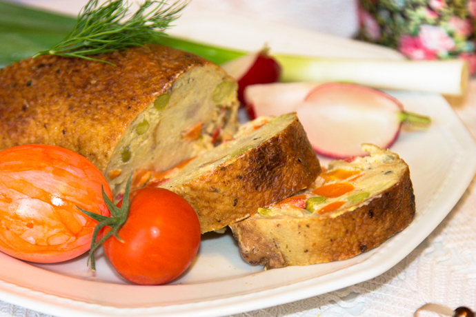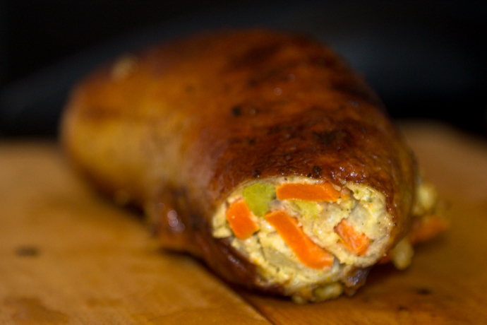 1 buc piele gat de gasca, 100 gr morcovi, 100 gr gulie, 100 gr cartofi, 100 gr mazare, 3 oua, 2 felii paine, sare, piper si cimbrisor, 2 linguri untura de gasca