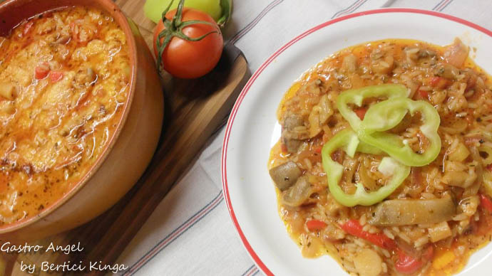 Ingredientele se spala si se maruntesc. Intr-un vas se pune uleiul la incins si se adauga ceapa, cand devine sticloasa se adauga restul legumelor.Orezul se fierbe separate, cand legumele s-au fiert destul, adaugam smantana, sosul de rosii, orezul si condimentele. Lasam 10 minute, presaram cu cascaval si se pune la cuptor pentru 15 minute.