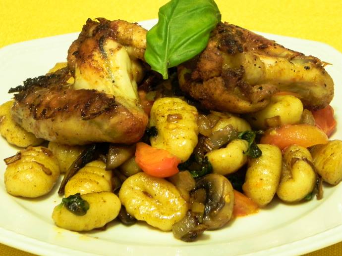 5 aripioare de pui, sare, piper, boia afumată,100 ml ulei, 200 g gnocchi, 100 g ciuperci, 3 roșii cherry, 50 g unt, 1⁄2 ceapă, busuioc