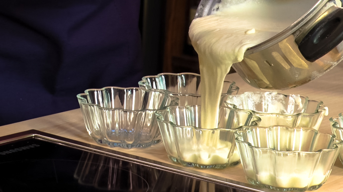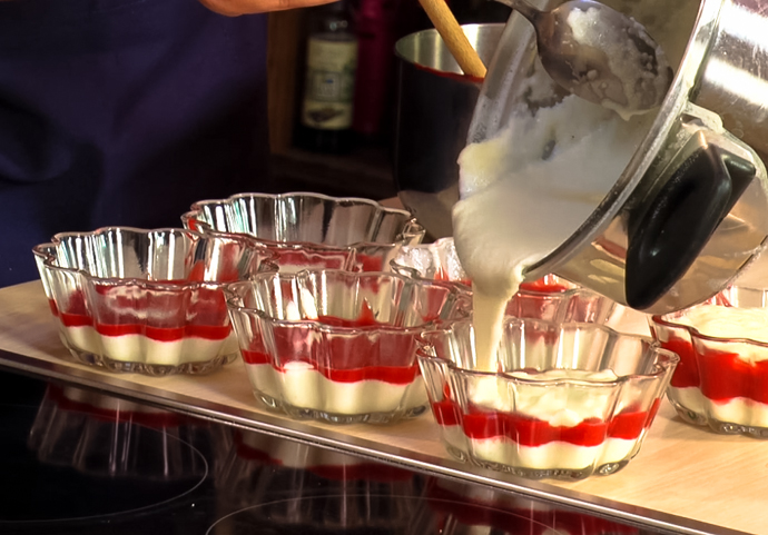Se fierbe laptele și laptele de cocos, apoi se adaugă grisul și vanilia. Ciocolata și frișca se topesc pe baie de aburi. Se stratifică.