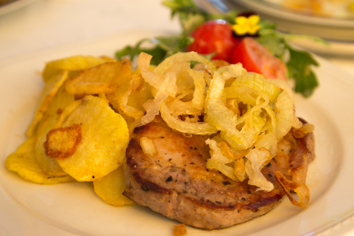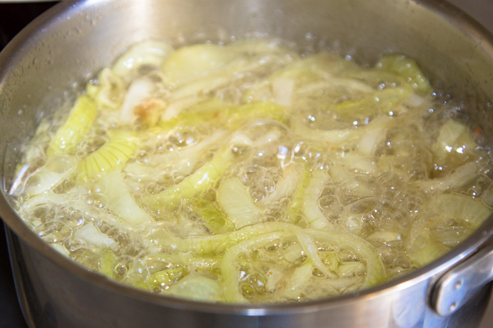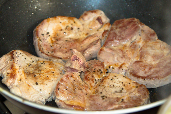 Feliile de carne se condimentează cu sare și piper, după care se ung, pe ambele părți, cu muștar. Se lasă la marinat pentru câteva ore. Se încinge într-o tigaie o lingură de ulei în care se prăjesc rapid ambele părți ale cărnii. Pentru fiecare felie de grătar se pregătește câte o ceapă. Cepele se taie rondele și se sărează. Se presară cu făină și se amestecă bine. Se încinge ulei într-o cratiță în care, în cantități mici, se prăjesc rondelele de ceapă până se rumenesc. Se scot pe șervețele de bucătărie.
