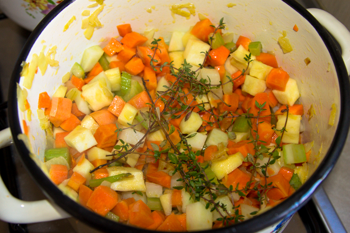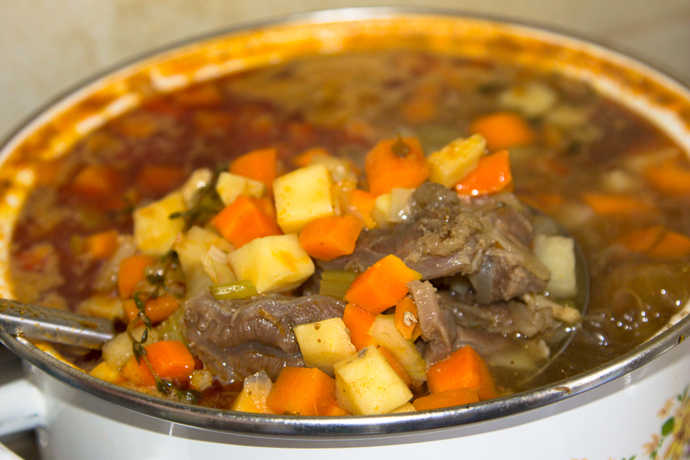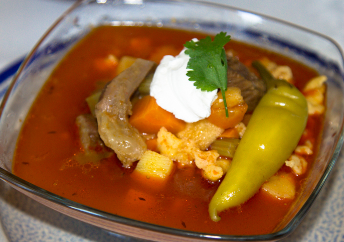 Se călește în ulei ceapa tocată mărunt și se adaugă legumele. Pe carnea tăiată cubulețe se toarnă apă, se condimentează cu sare, piper și foi de dafin. Se lasă pe foc până carnea se înmoaie pe jumătate. Se condimentează legumele după gust. Când carnea se înmoaie se adaugă la legume. Se adaugă cartofii tăiați cubulețe. Se lasă la foc redus până toate ingredientele se înmoaie. Pentru găluște se bat ouăle și se omogenizează cu făina. Compoziția se rupe în supă și se mai lasă la fiert încă 10 minute.