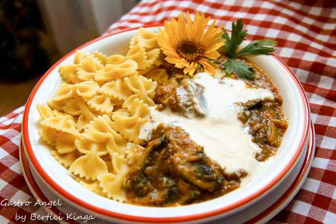 Ceapa rosie se caleste in putin ulei pana devine sticloasa, adaugam carnea tocata de porc si le frigem bine.Punem ciupercile, apoi rosiile taiate cubulete, le fierbem. Adaugam sosul de rosii, zaharul, sarea, piperul, condimentele maruntite, apoi le fierbem cu capac. Se ingroasa cu faina. Intre timp fierbem macaroanele, apoi se poate servi.