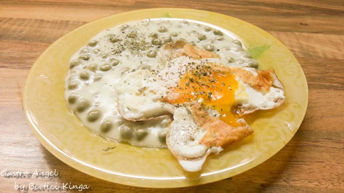 Din ulei si faina se pregateste rantasul, adaugand usturoiul. Cand primeste culoare adaugam laptele si mazarea spalata. Se condimenteaza dupa gust cu sare si piper. In 10-15 minute se ingroasa.Este practica si se pregateste repede. Se poate servi cu snitel, ou, carnat.