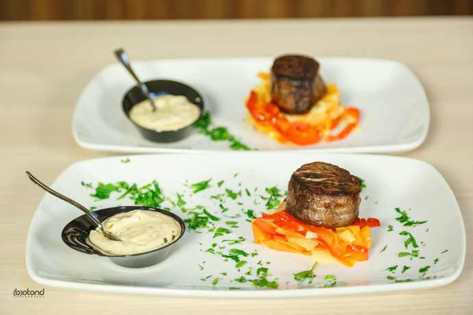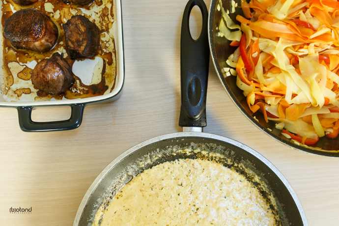 Legumele se taie lung si se prajesc in ulei. In tigaia in care s-a fript carnea se pune vinul si apa, cu o lingura de lemn se amesteca cu ramasitele de carne, si se lasa sa fiarba pana scade la jumatate. Se adauga tarhonul si se mai fierbe pana ajunge la 100 ml. Se mai sareaza, pipereaza dupa gust. La sfarsit se adauga smantana.