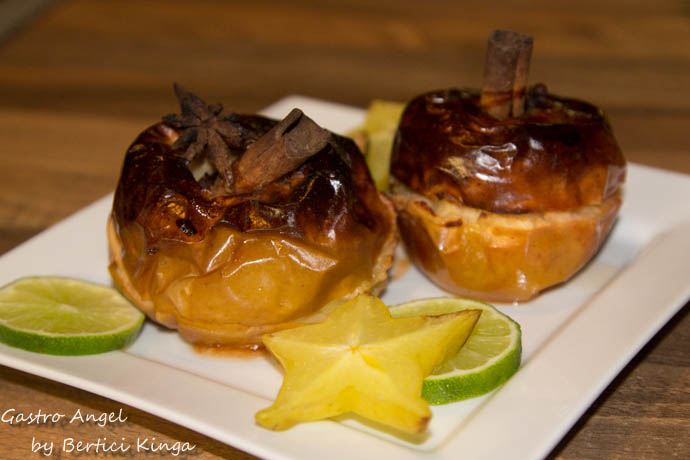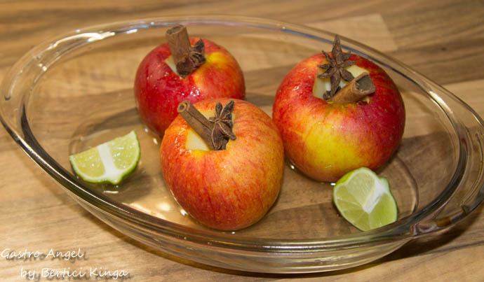 Merele se spală și se scoate miezul cu sâmburi. Se stropesc cu suc de lămâie și se așează în tavă unsă. Se presară cu scorțișoară. Cuișoarele și anisonul se pun în tavă. Se adaugă vinul.