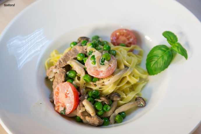 1 ceapă, 1 usturoi, ½ ardei, 2 roșii cherry,100 g ciuperci, 100 g mazăre, 150 g mușchi vită, 150 ml crème fraiche, sare, piper, busuioc, 300 g paste tagliatelle
