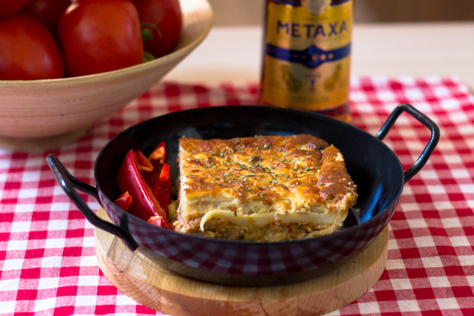Legumele se taie felii și se prăjesc (cel mai simplu în friteuză). Pentru sosul de carne se prăjește, în puțin ulei, ceapa și usturoiul, se adaugă toate condimentele și zahărul, apoi se adaugă carnea. Când carnea și-a schimbat culoarea, se adaugă roșiile și se subțiază cu metaxa. Se lasă pe foc până carnea se înmoaie.