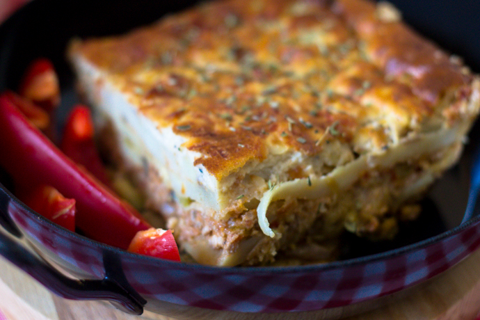 Se presară cu pesmet fundul unui vas de yena, apoi se adaugă, pe rând, un strat de vinete, unul de dovlecel, unu de cartofi și sosul de carne. Se mai pune încă câte un strat de legume care se acoperă cu sosul besamel. Se presară cu cașcaval. Se dă la cuptor încins la 190 de grade pentru 40 de minute.