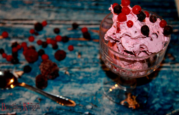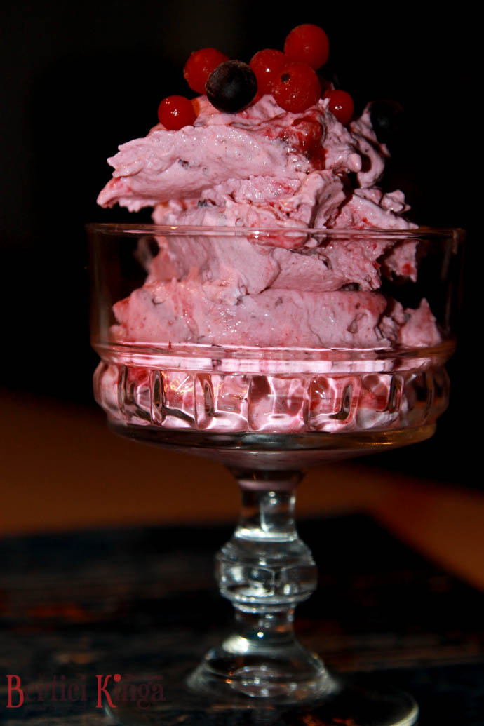 Fructele congelate se zdrobesc cu mixerul, se adaugă frișca. Se amestecă timp de 2 minute și se poate servi. Îmi place această rețetă pentru că se poate prepara cu multe fructe, dar nu numai :)