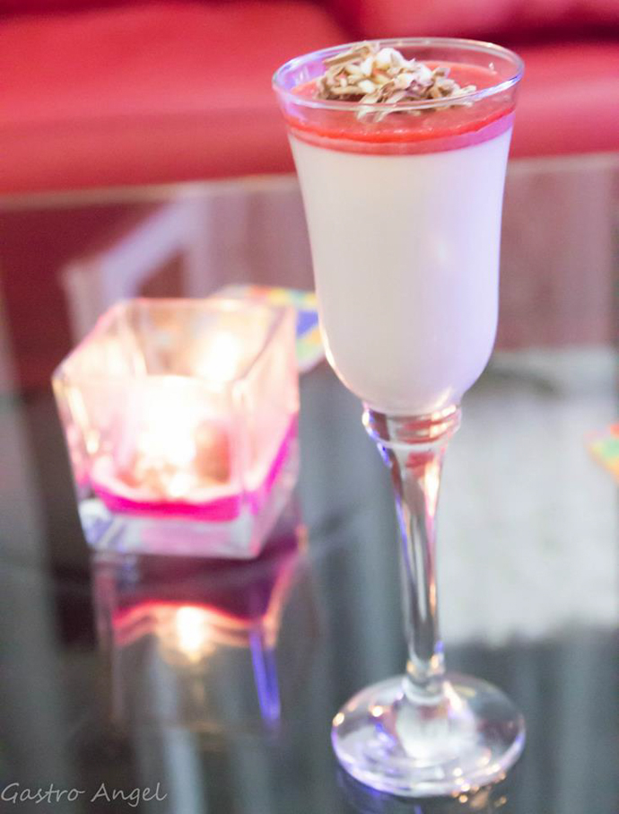 Frișca, laptele, coaja de lămâie, zahărul și aroma de vanilie se fierb, apoi se ia de pe foc și se adaugă foile de gelatină. Se strecoară să nu rămână cu rămășițe de coajă de lămâie. Se toarnă în pahare. Se răcește. Se ornează cu turmix de fructe și ciocolată rasă.