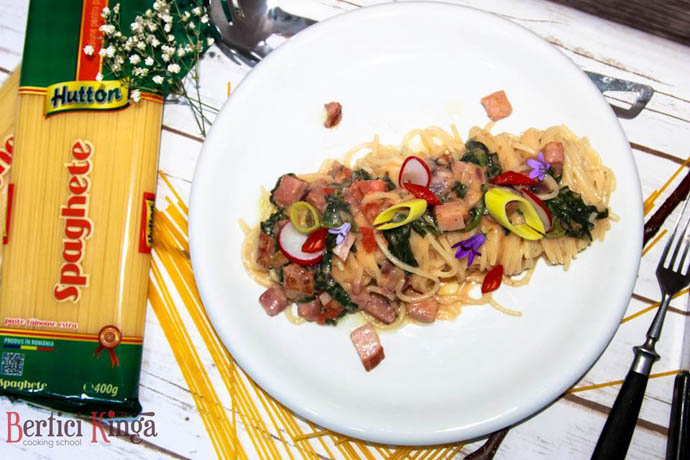 Se fierb pastele în apă cu sare. Uleiul se încinge întro tigaie, se călește ceapa, usturoiul și chili. Se adaugă șunca și se subțiază cu supa. Se lasă să fiarbă. Se condimentează, după care se adaugă spanacul. Se stropește cu ulei de măsline și se servește.
