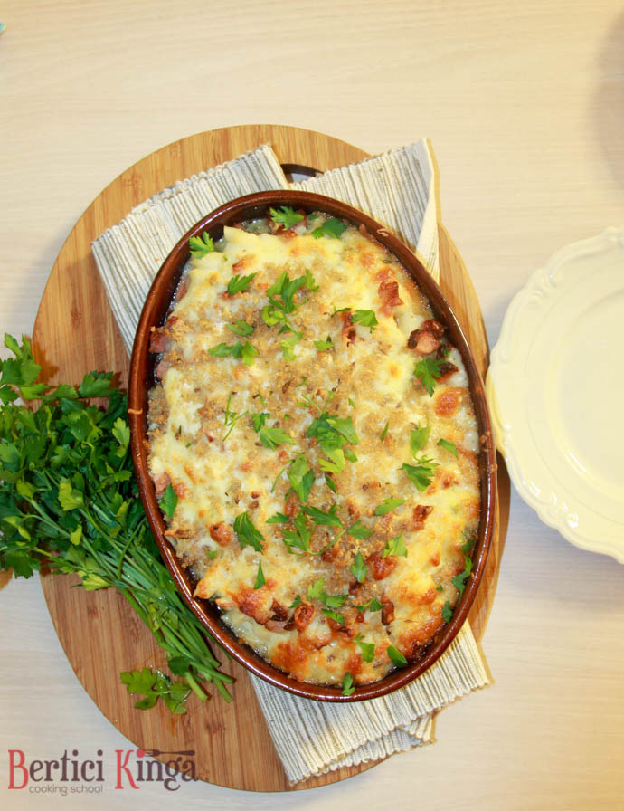 Compoziția se așează într-un vas de yena, se acoperă cu sosul apoi cu baconul. Se presară cu cașcaval și pesmet. Se lasă la cuptor încins la 200 de grade timp de 30 de minute.