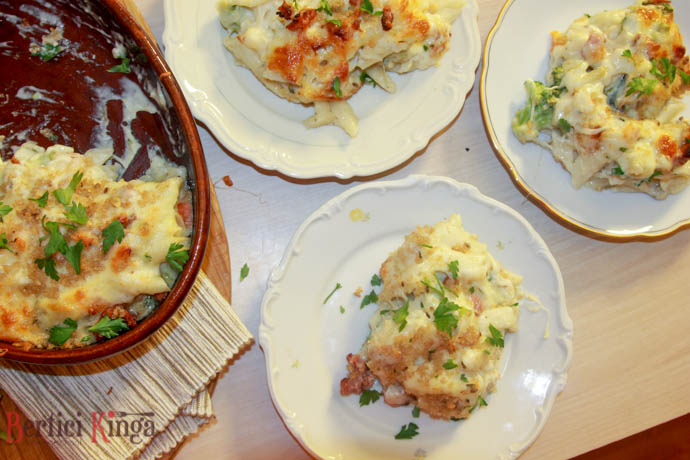 100 g bacon, 200 g broccoli, 100 g mozarella, 100 g cașcaval afumat, 100 g unt, 3 linguri făină, sare, piper, chili, 2 căței usturoi, anchoise, cimbrișor, usturoi, 500 ml lapte, 1 pungă penne, pesmet