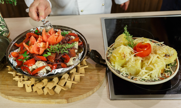 250 g piept de pui, 150 g slănină, 2 cepe, ardei dulce roșu, 100 g ciuperci, ulei, sare, piper, lămâiță, 1 lingură pastă de roșii, 1 lingură dulceață de afine, 4 cartofi, 150 g brânză de capră