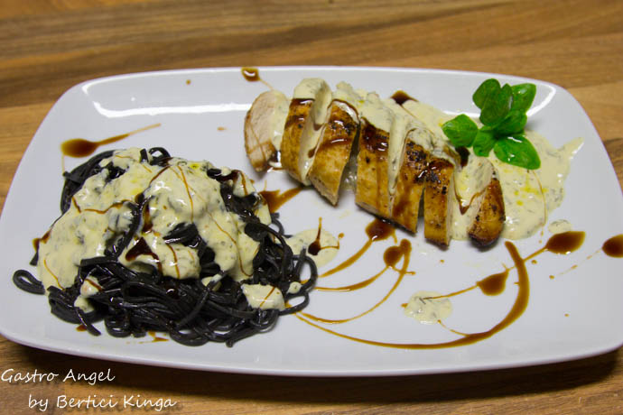 1 piept de pui taiat in doua, sare,piper, 30 gr unt, 1 lingura ulei de masline