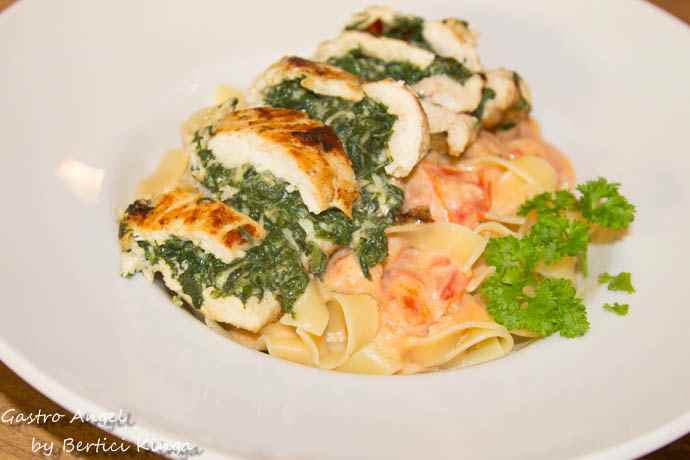 Se infige pieptul de pui si se umple cu crema de spanac. Se frige in putin ulei intr-o tigaie.