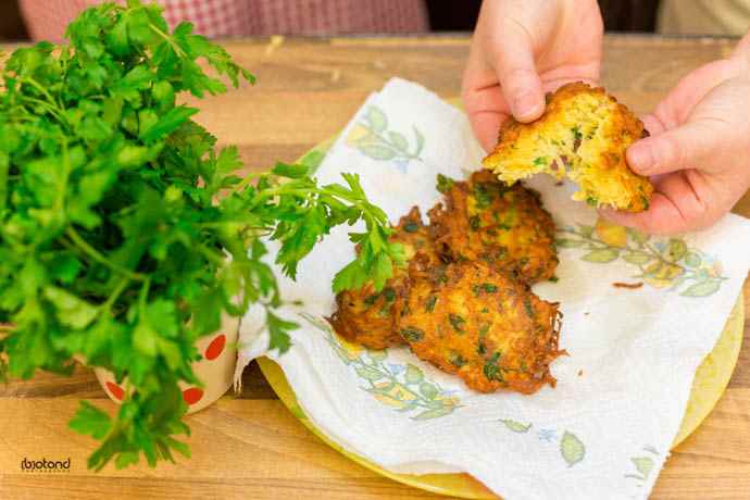 Curățim cartofii, îi răzuim, îi stoarcem de zeamă. Răzuim usturoiul, amestecăm cu cartofii, și restul de ingrediente. Formăm cu lingură și îi frigem în ulei încins.