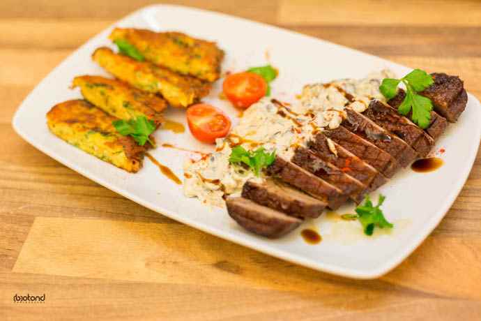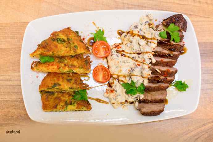 Pentru sos adunam rămășițele de carne și mirodenii din tigaie, apoi în puțin ulei frigem ceapa și ciupercile. Adaugăm smântâna și la sfârșit untul.