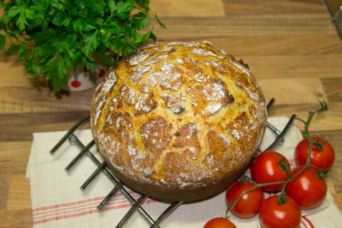 Se amestecă toate ingredientele. Aluatul se frământă 10 minute. Șunca și cașcavalul se adaugă doar la sfârșit. Se lasă 40 de minute la dospit după care se dă la cuptor încins la 230 de grade timp de 30-40 de minute.